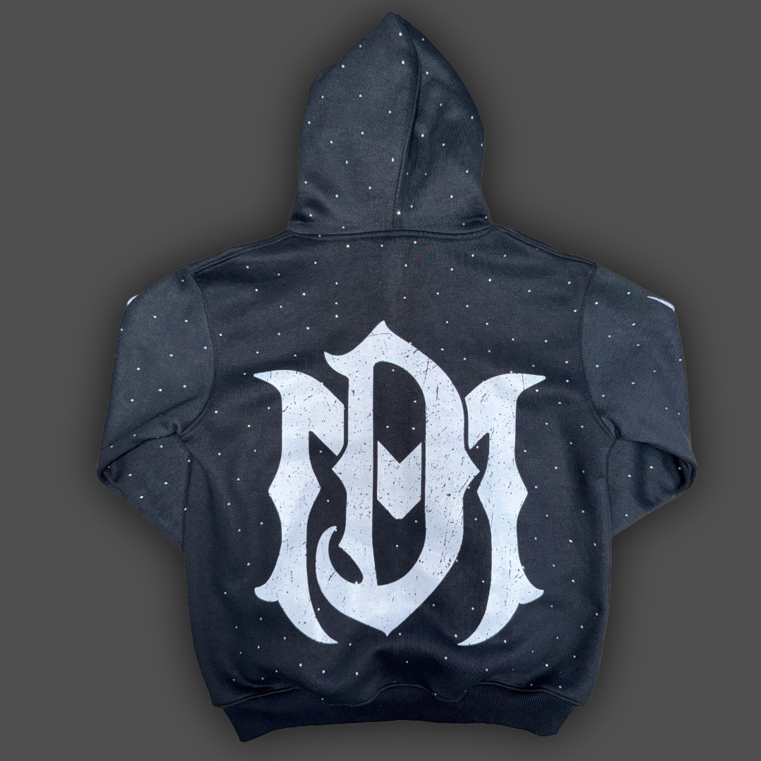 Black pullover hoodie with front “Diamonds and Money” graphic. Flame graphics on both sleeves and speckle detailing throughout. Large gothic-style monogram graphic on the back. Ribbed cuffs and hem.