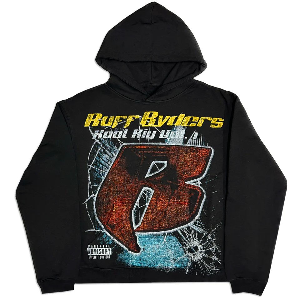 Black pullover hoodie featuring a Dry Rot graphic with a racing-inspired illustration and scenic backdrop on the front.