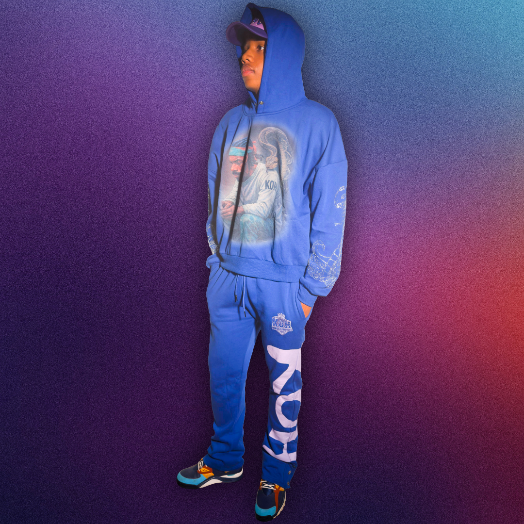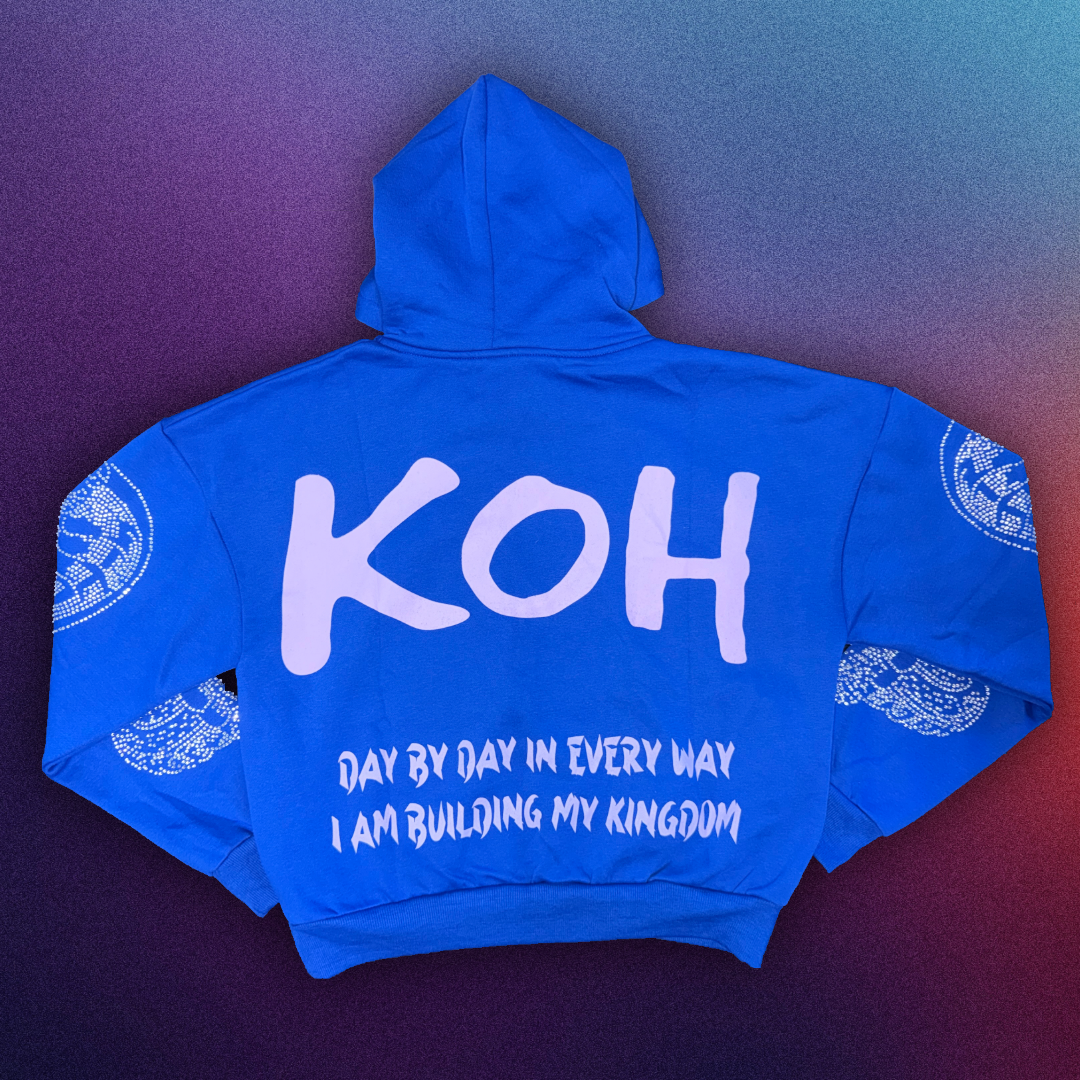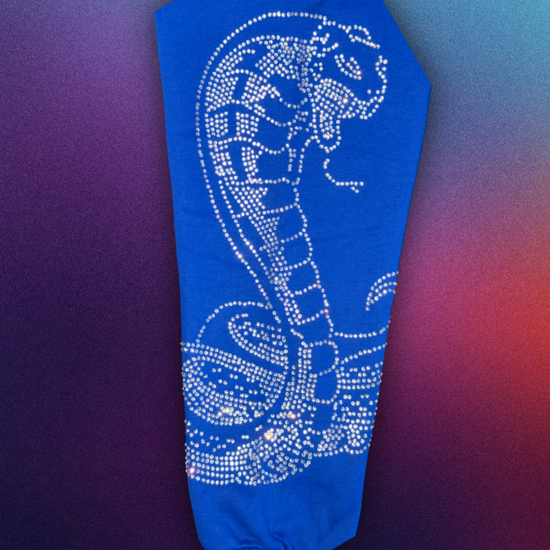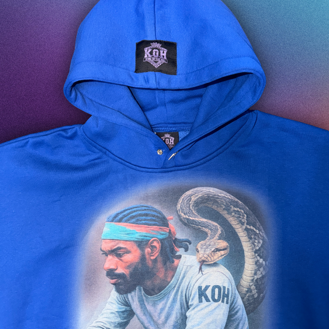 A standout KOH hoodie in Blue Majesty, featuring striking purple KOH text on the chest and a rhinestone cobra sleeve hit symbolizing awareness and preparation. The artwork speaks to the king who thinks before he acts, studying the snakes around him with patience and confidence. Completed with precision metal hardware and a custom patch.