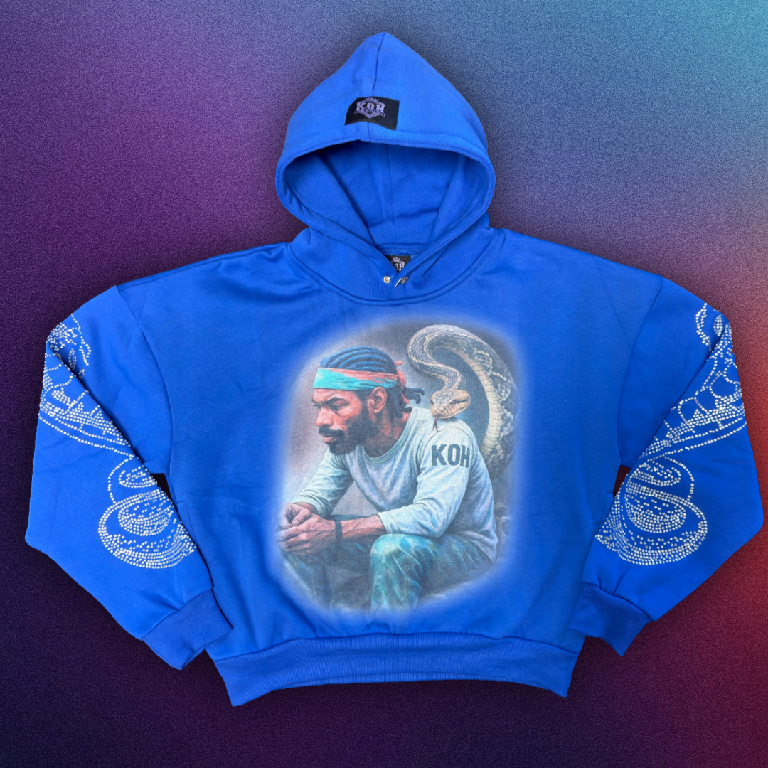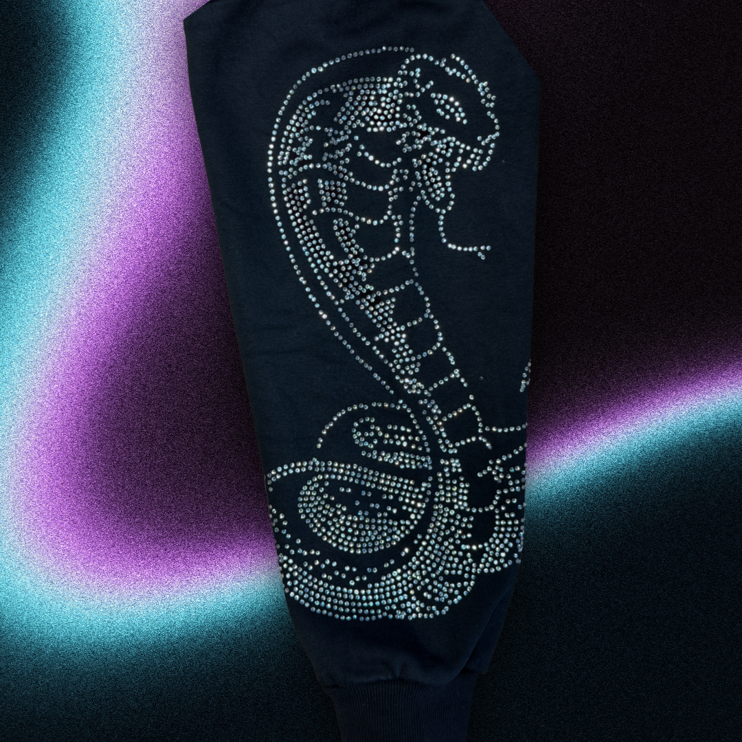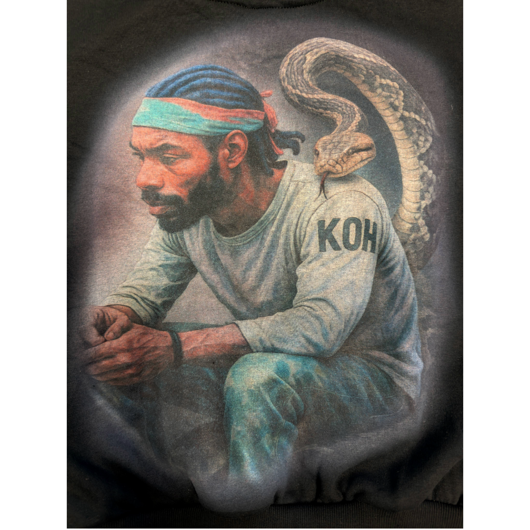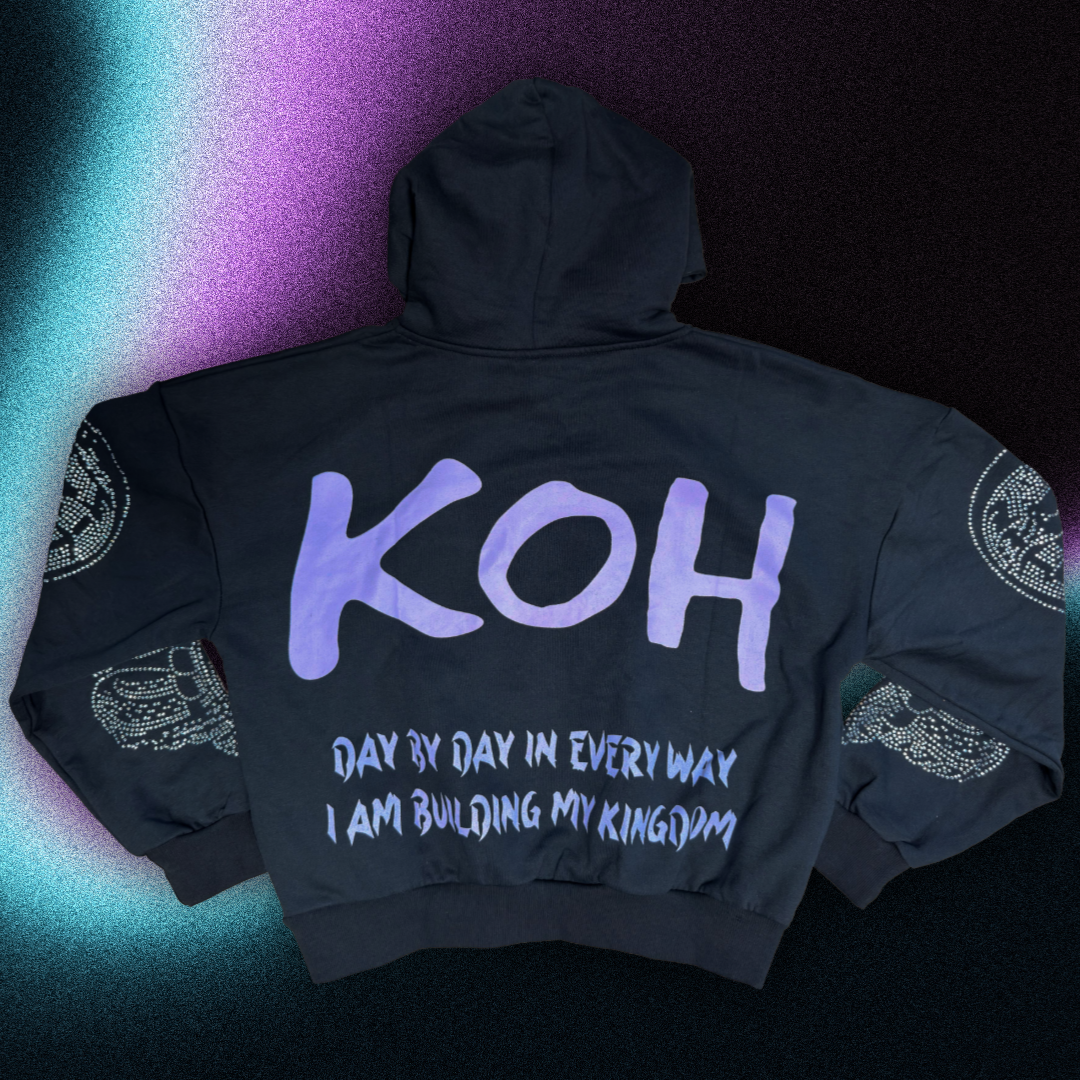 The Phantom Black KOH hoodie delivers bold purple lettering and an eye-catching rhinestone cobra cascading down the sleeve. The design represents calm power — a king pausing to observe the snakes that circle his throne. Enhanced with custom KOH hardware and a detailed hood badge.