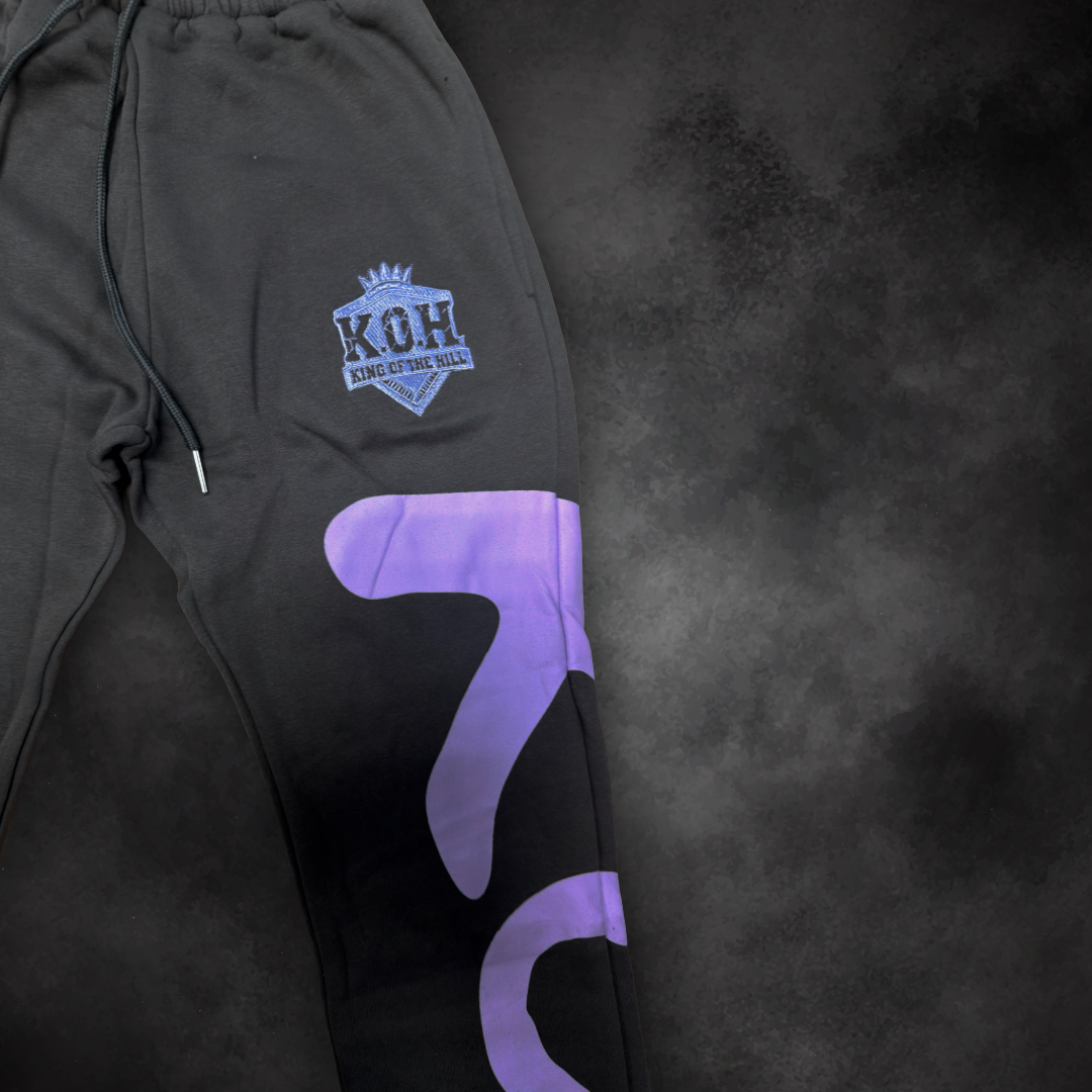 These Smoke Gray KOH pants feature bold purple text and a relaxed flare-leg cut. The ankle zipper adds shape and movement, while custom-engineered KOH hardware gives the piece its premium finish.