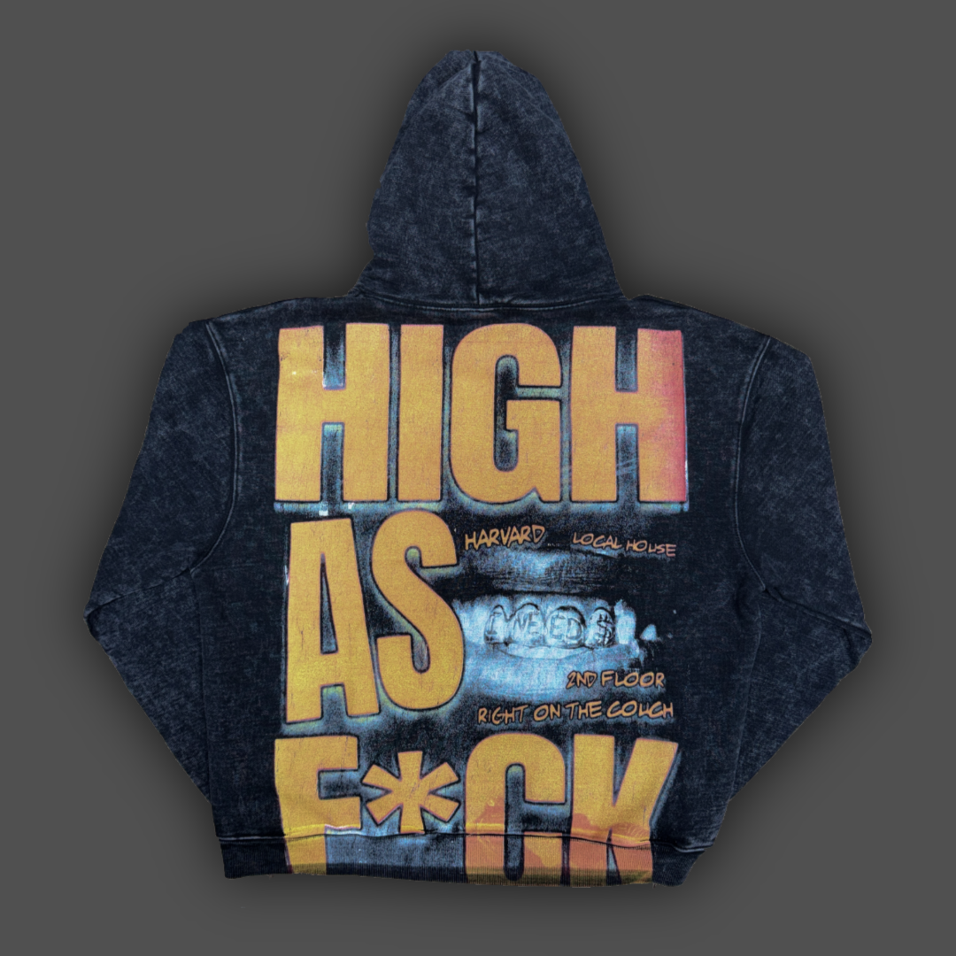 Kool Kiy washed black hoodie featuring large “HOW HIGH” typography with character artwork on the front. The back features oversized “HIGH AS F*CK” text with handwritten-style details referencing Harvard, Local House, and couch culture. Vintage-wash fleece with bold front-and-back print.