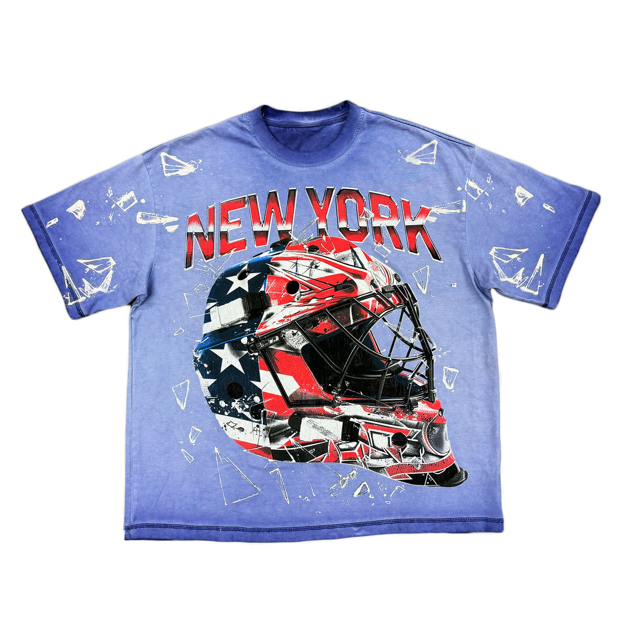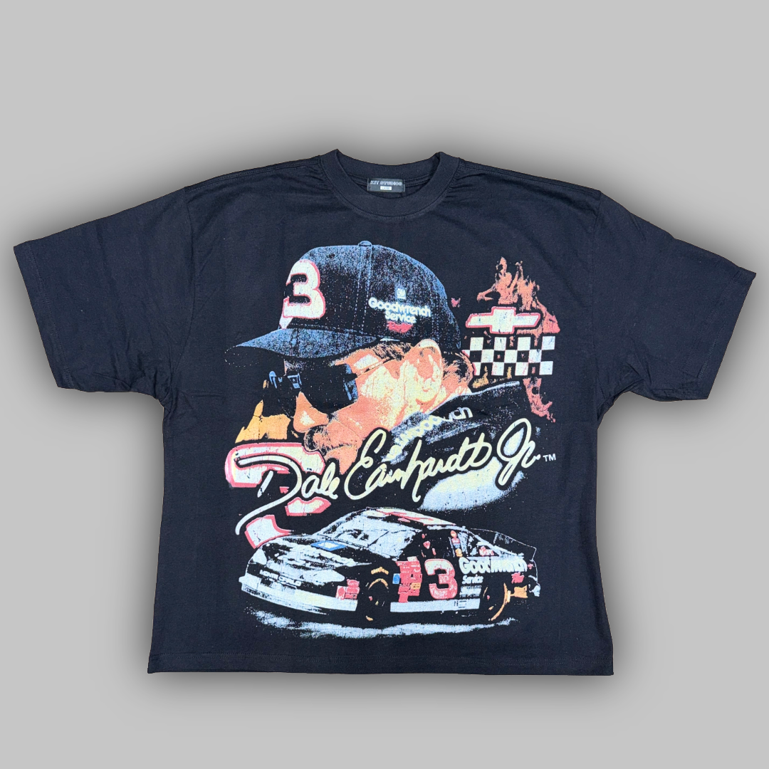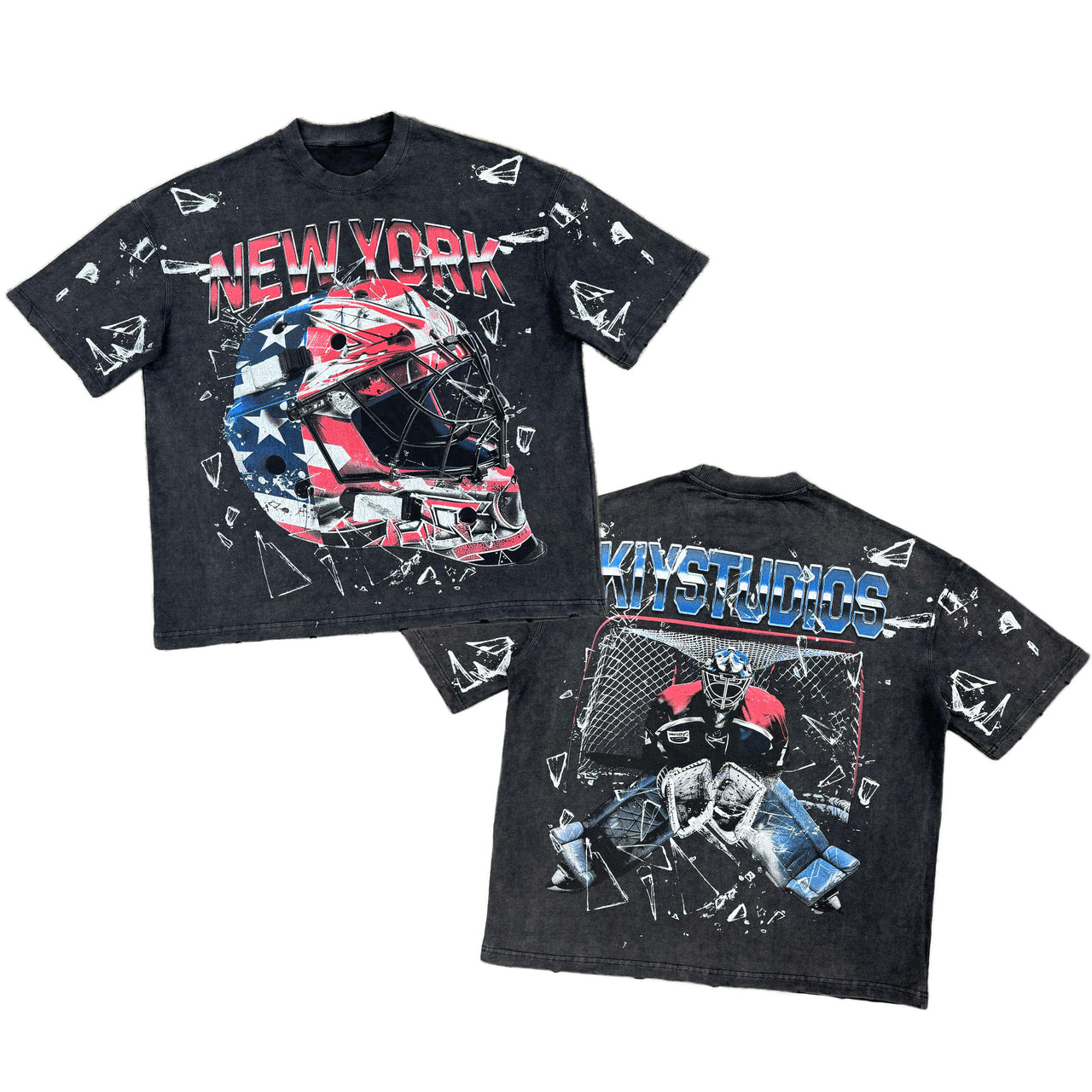 Heavyweight tee with a custom grunge wash in black and screen-printed front and back graphics.