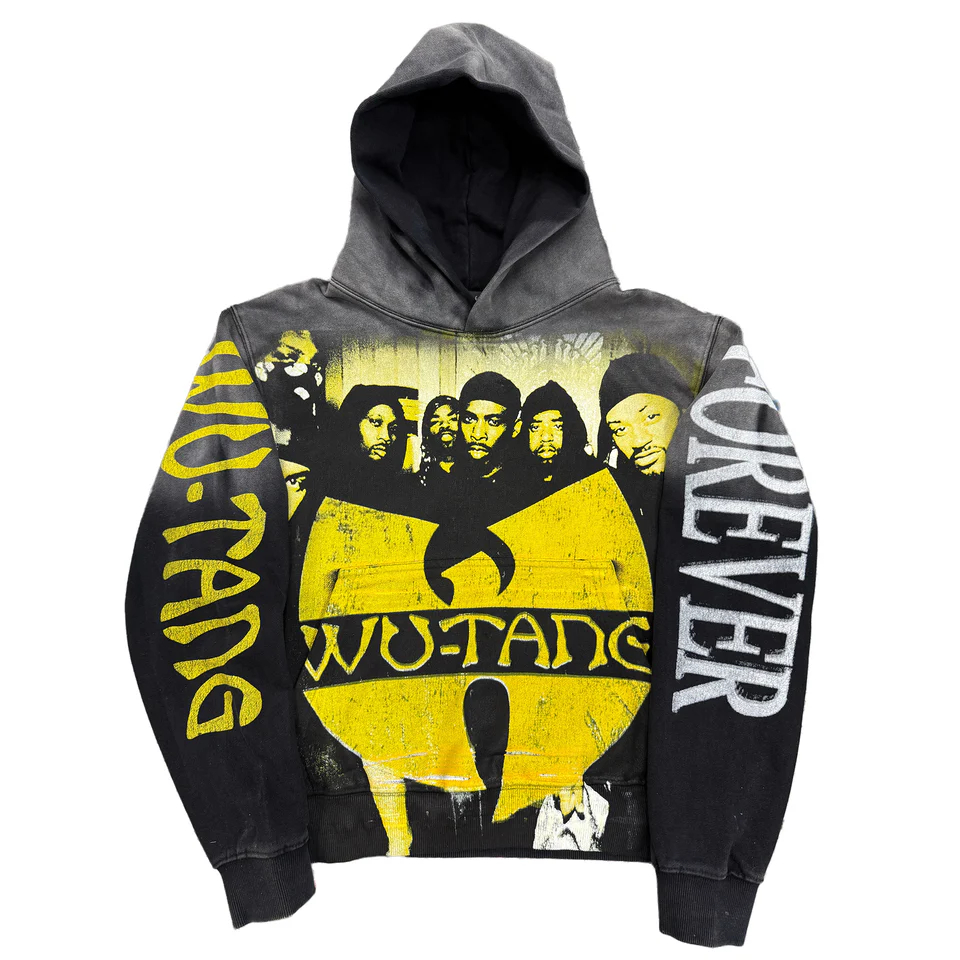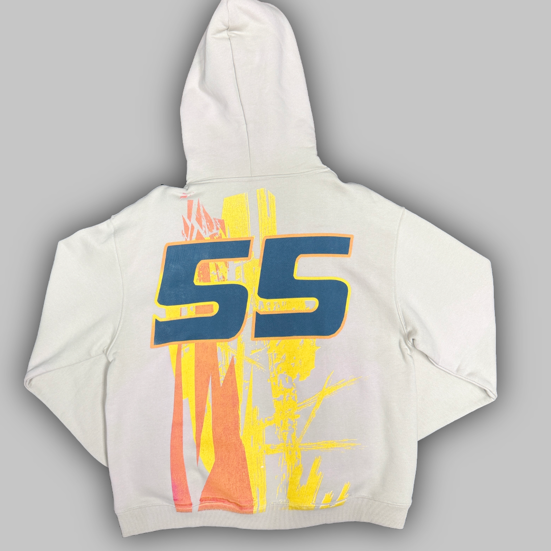 Cream hoodie with bold racing-inspired graphics, featuring a high-energy front illustration and a large numeric back detail layered over distressed paint textures. Designed with a strong motorsport aesthetic and visual movement.