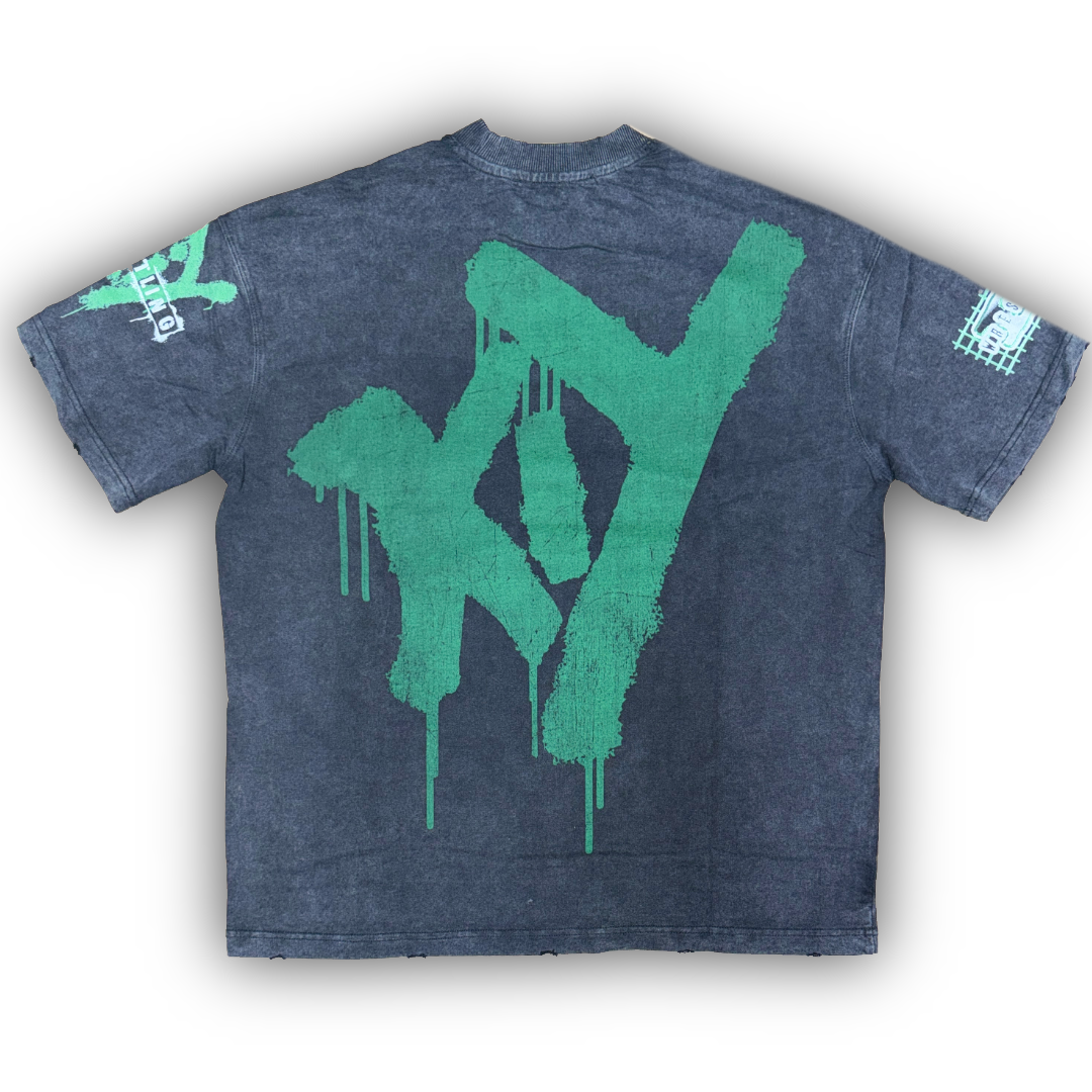 Kool Kiy heavyweight WWF tee featuring a DX group photo graphic on the front with green grid detailing and a large dripping “DX” graphic on the back. Vintage wrestling aesthetic with bold contrast and attitude.