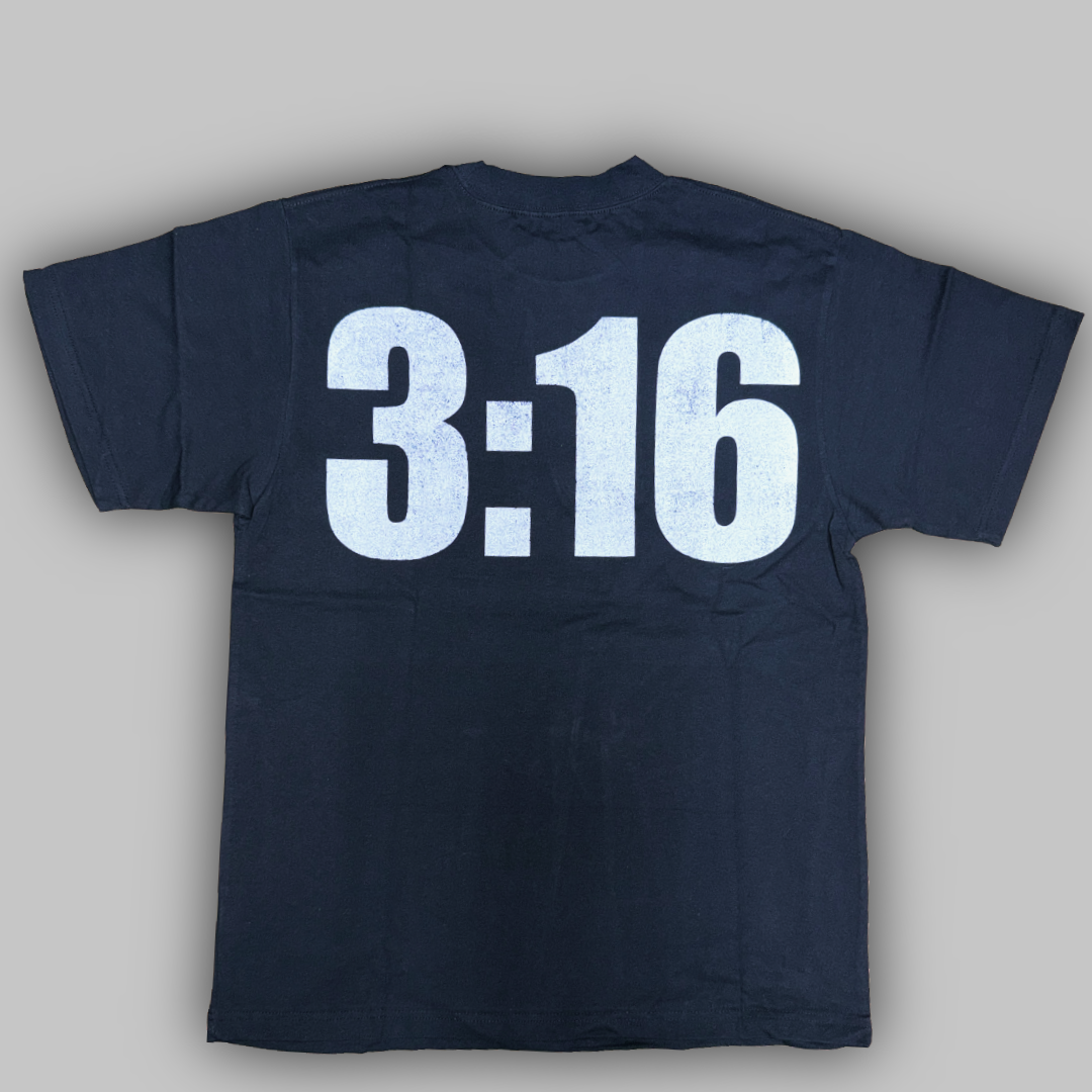 Kool Kiy heavyweight WWF tee featuring a large flaming Stone Cold skull graphic on the front, skeletal hands across the sleeves, and bold “3:16” typography on the back. Aggressive, iconic wrestling-era artwork with full visual impact.