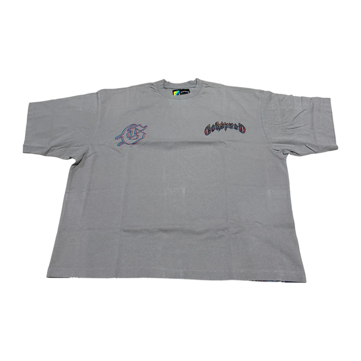 The Godspeed Natural Disaster Tee in stone wash features cracked chrome lettering across the chest, representing chaos and resilience. Crafted from heavyweight cotton with a vintage wash finish, it’s designed for an elevated fit and bold street-ready statement.