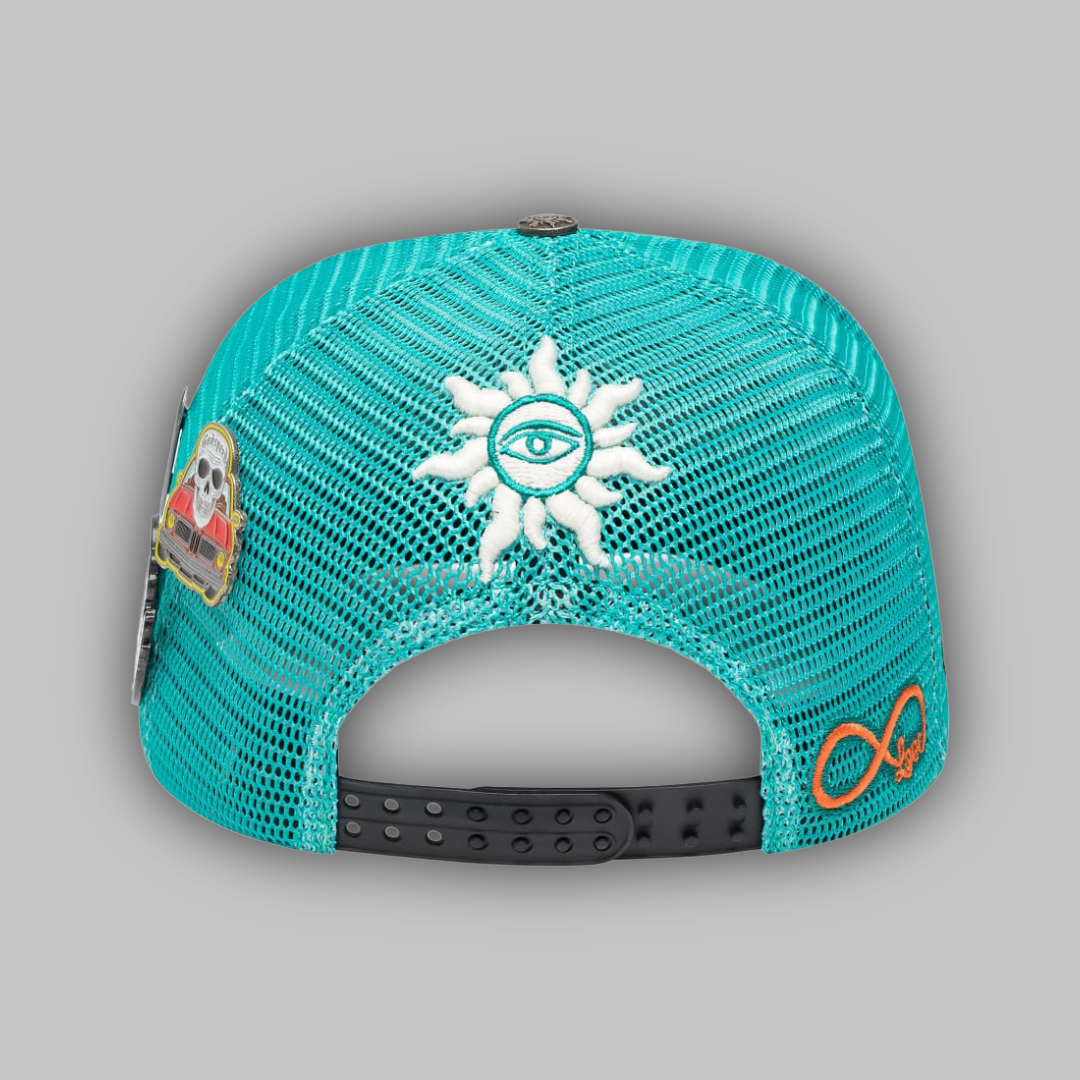 Classic Godspeed trucker hat featuring bold “Godspeed Forever” embroidery across the front. Constructed with a structured front panel, breathable mesh back, and curved brim for everyday wear. Adjustable snapback closure ensures a comfortable fit.