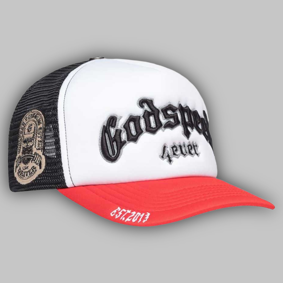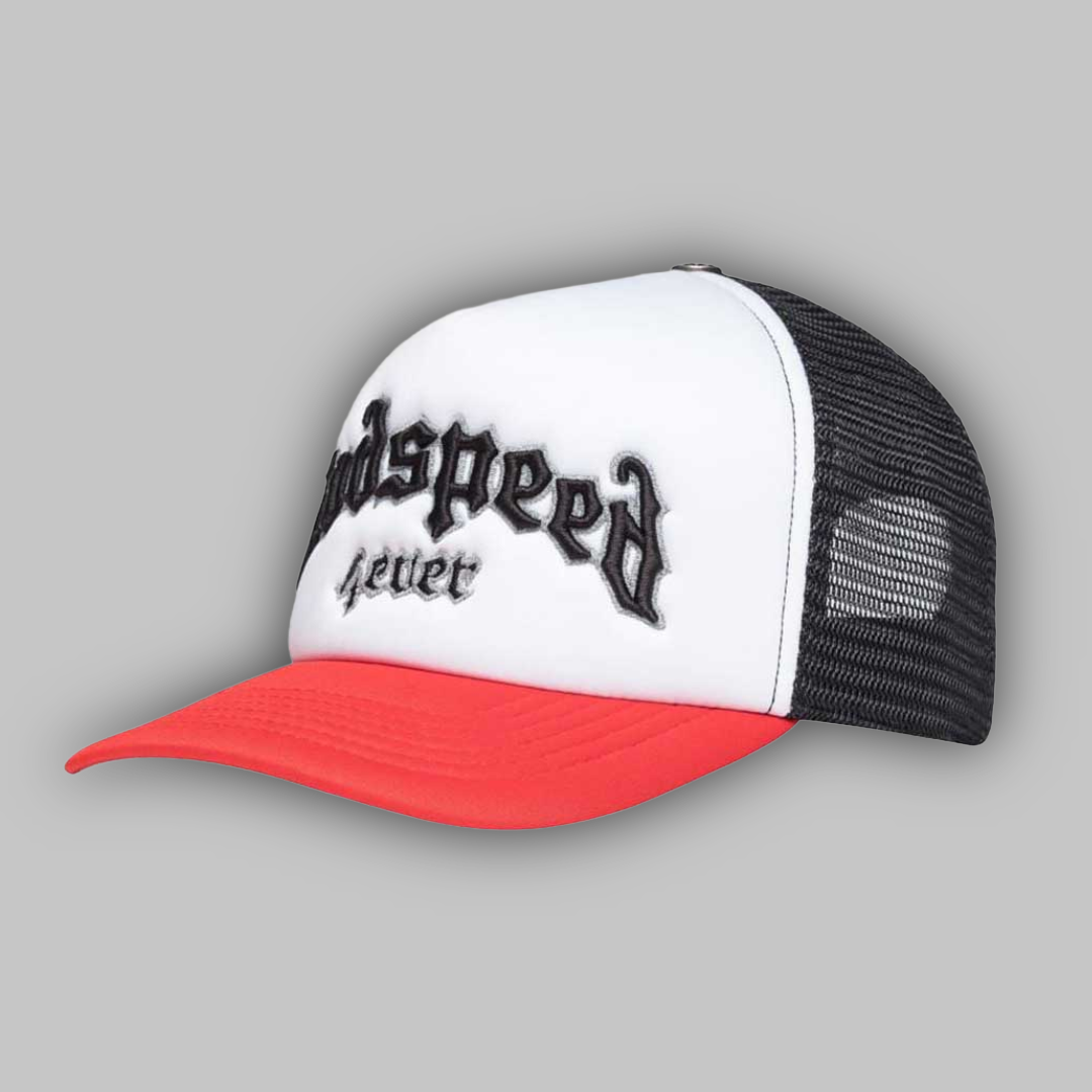 Godspeed Forever trucker hat with a white front panel and red brim accent. Features bold embroidered lettering, breathable mesh backing, and an adjustable snapback for all-day comfort.