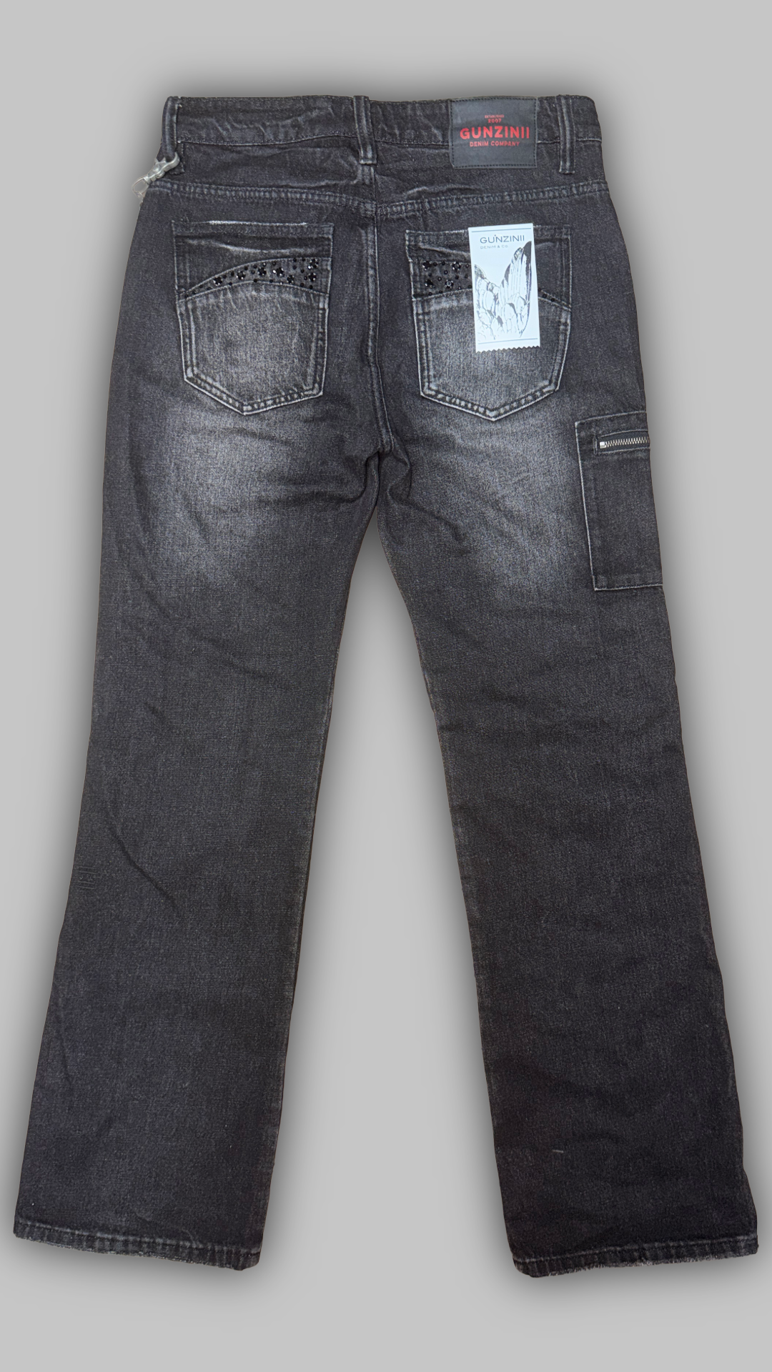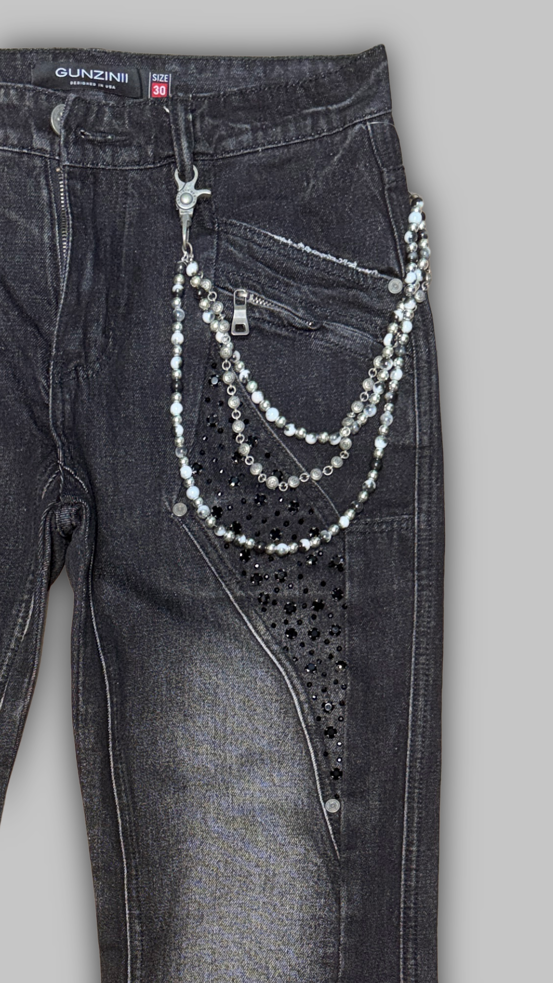 Black-wash Gunzinii denim featuring studded panel detailing, distressed knee abrasions, utility pocket accents, and a detachable bike chain. Built with a structured fit and heavy detailing for a rugged, statement-driven look.