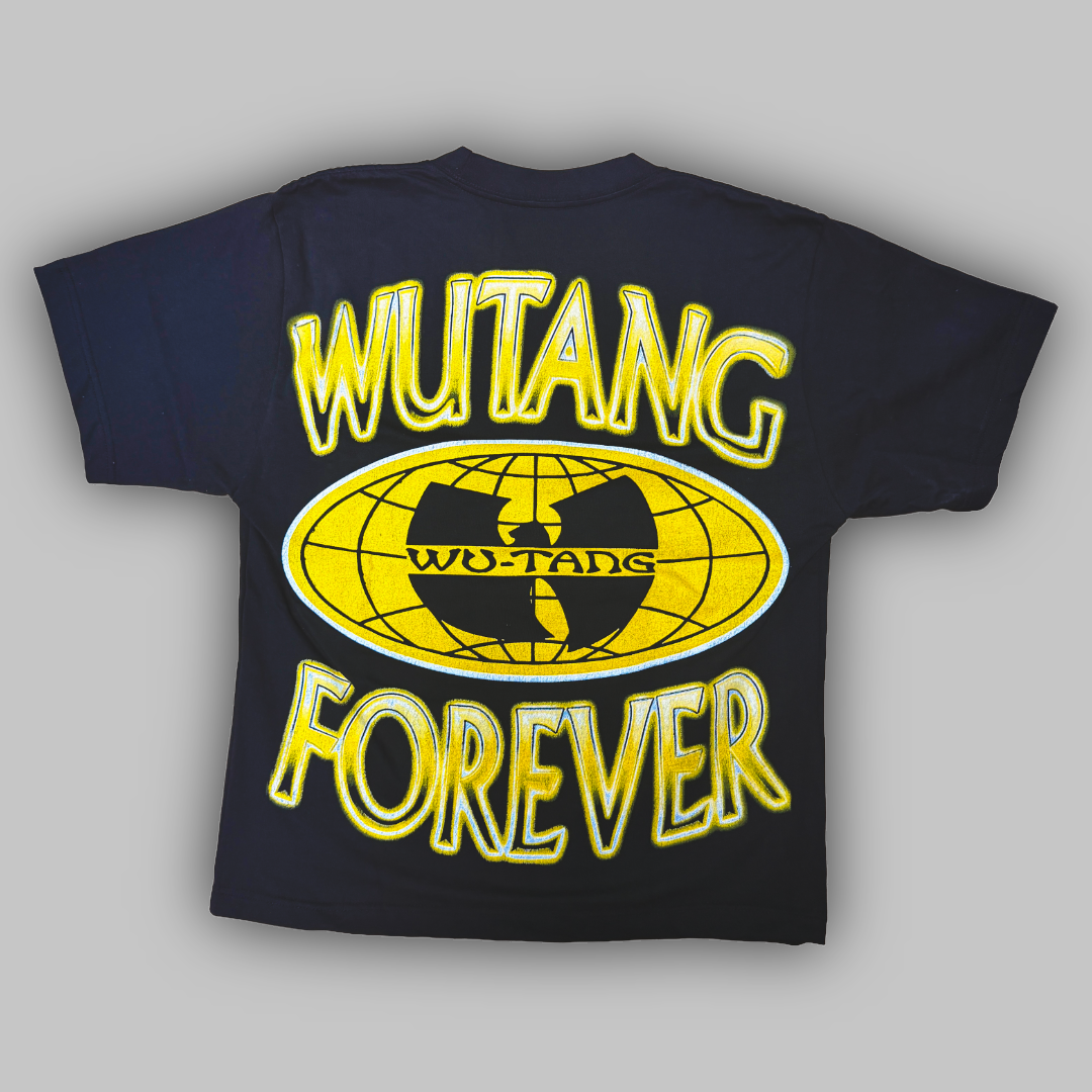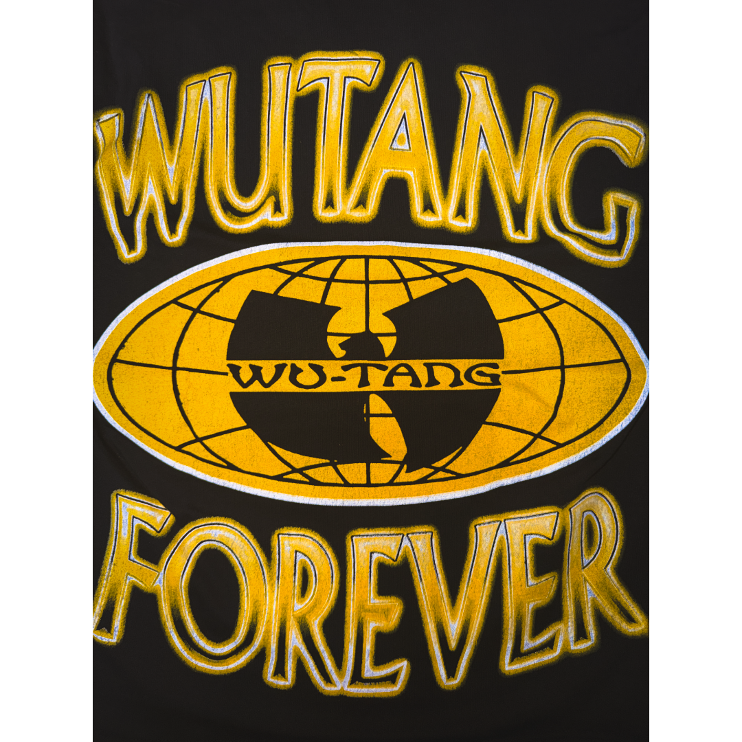 Heavyweight vintage black hoodie featuring Wu-Tang Forever graphics printed across the front, back, and sleeves. Oversized yellow Wu logo with group portrait and distressed wash finish.
